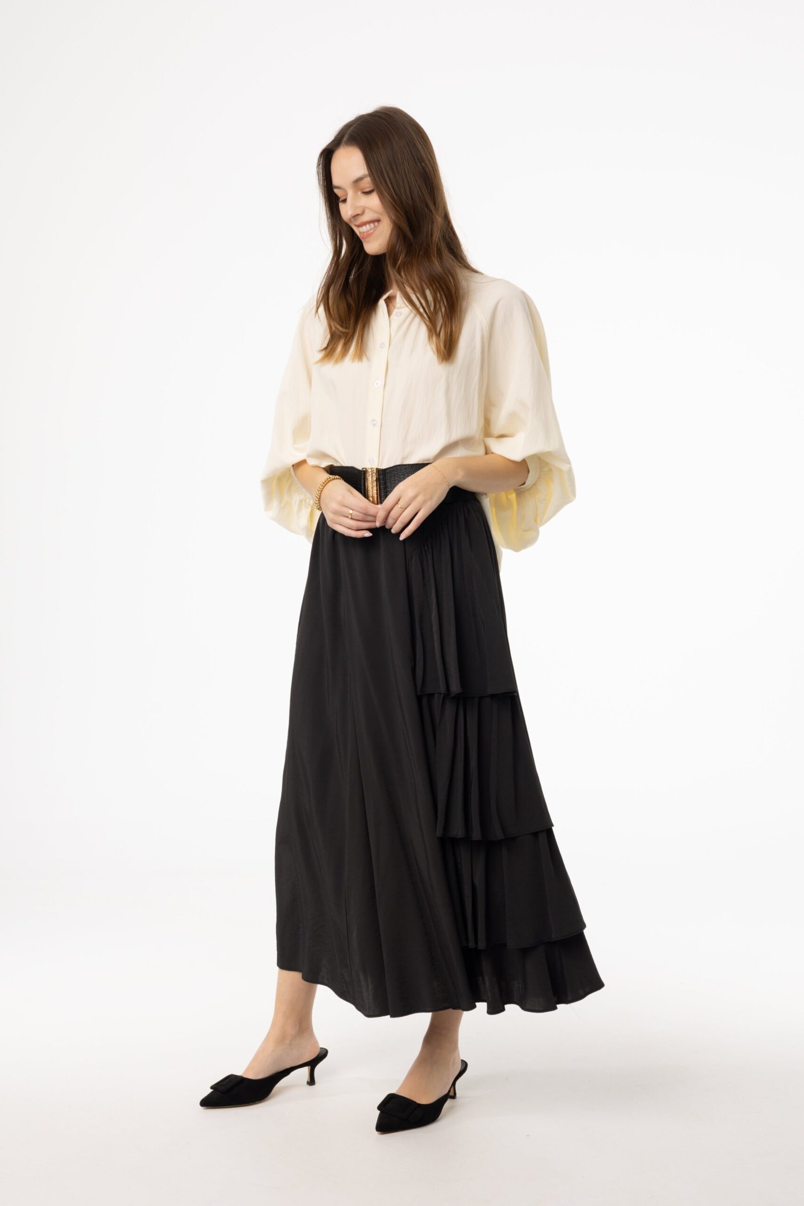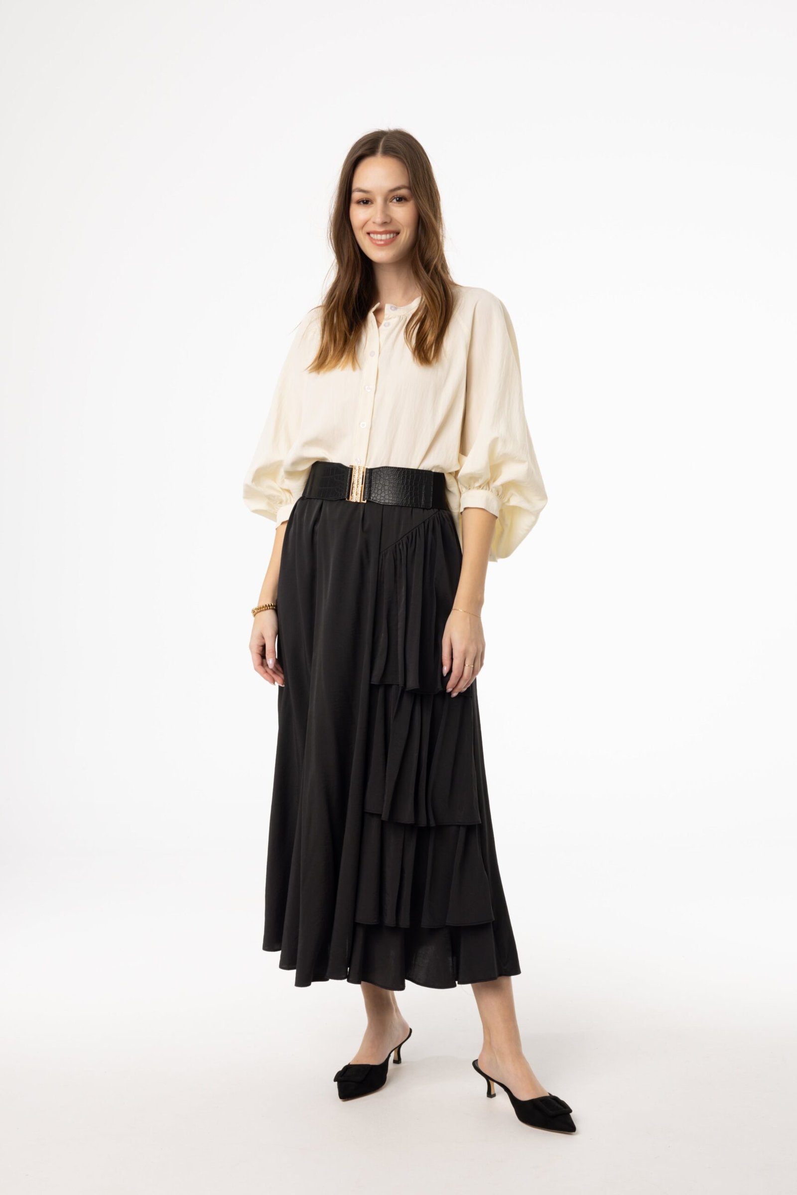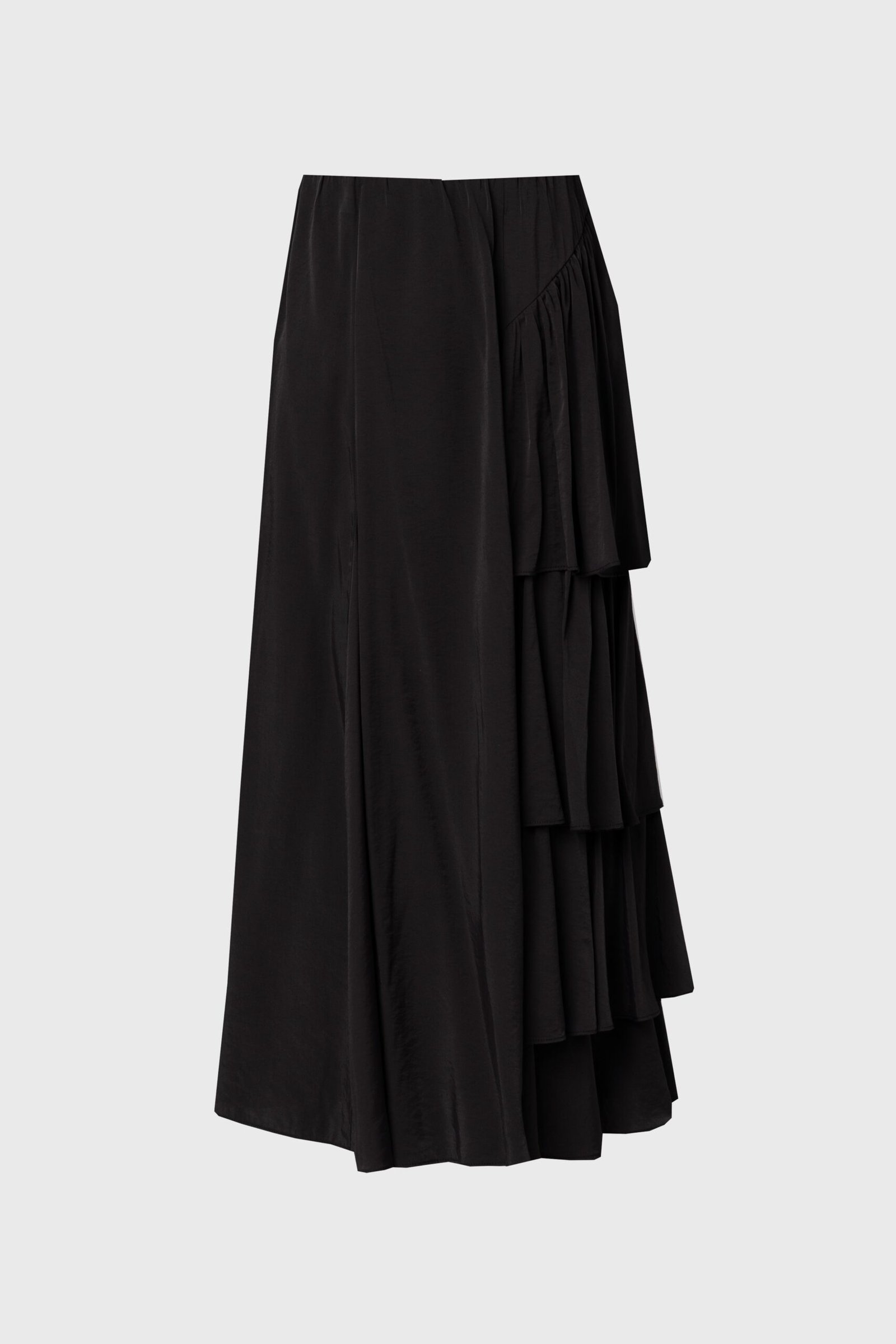 Make a statement at a summer art gallery or cultural exhibit with this side ruffle skirt. The elegant ruffle detail adds dimension and style. while the versatile black color ensures a timeless look.