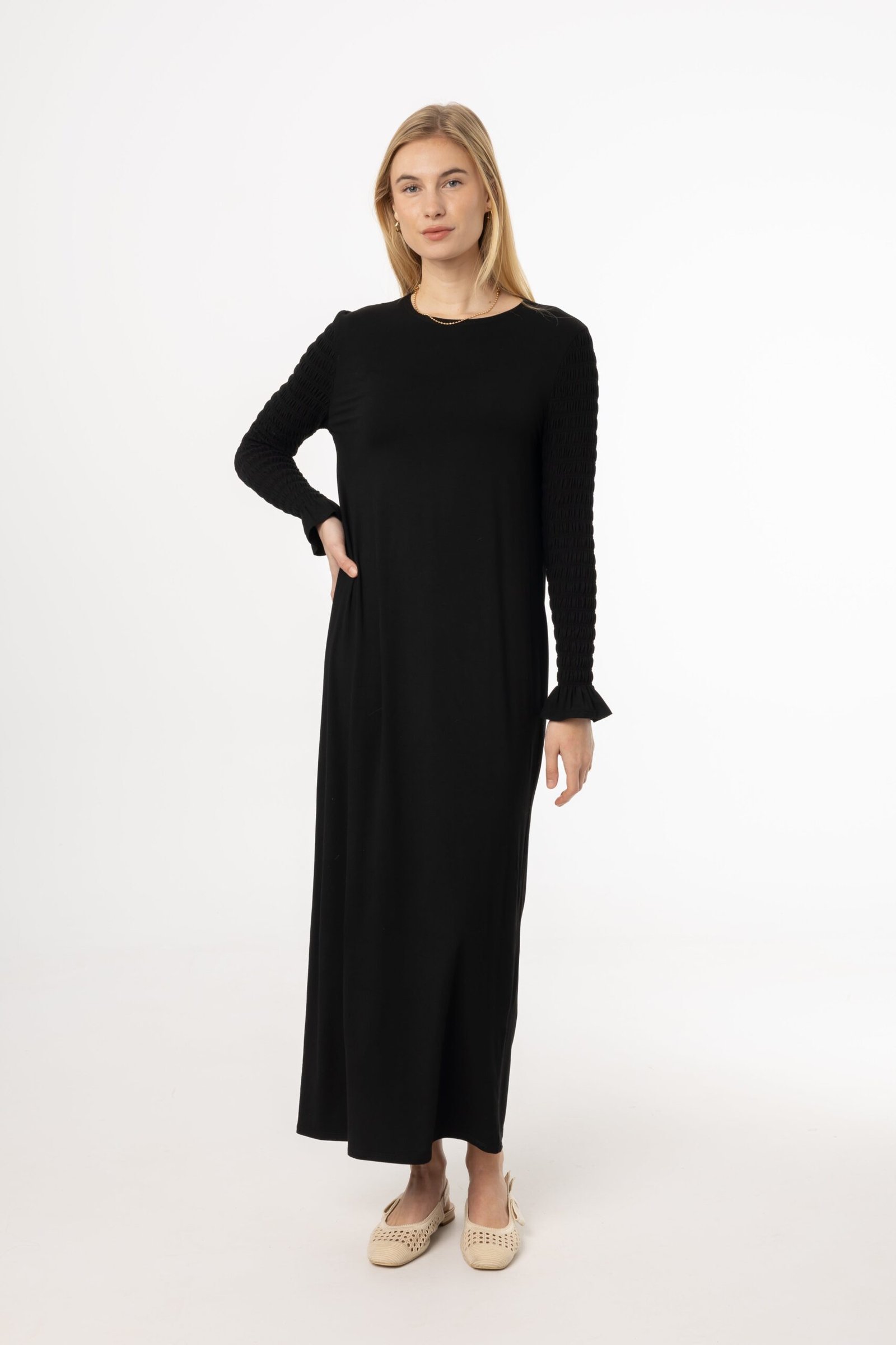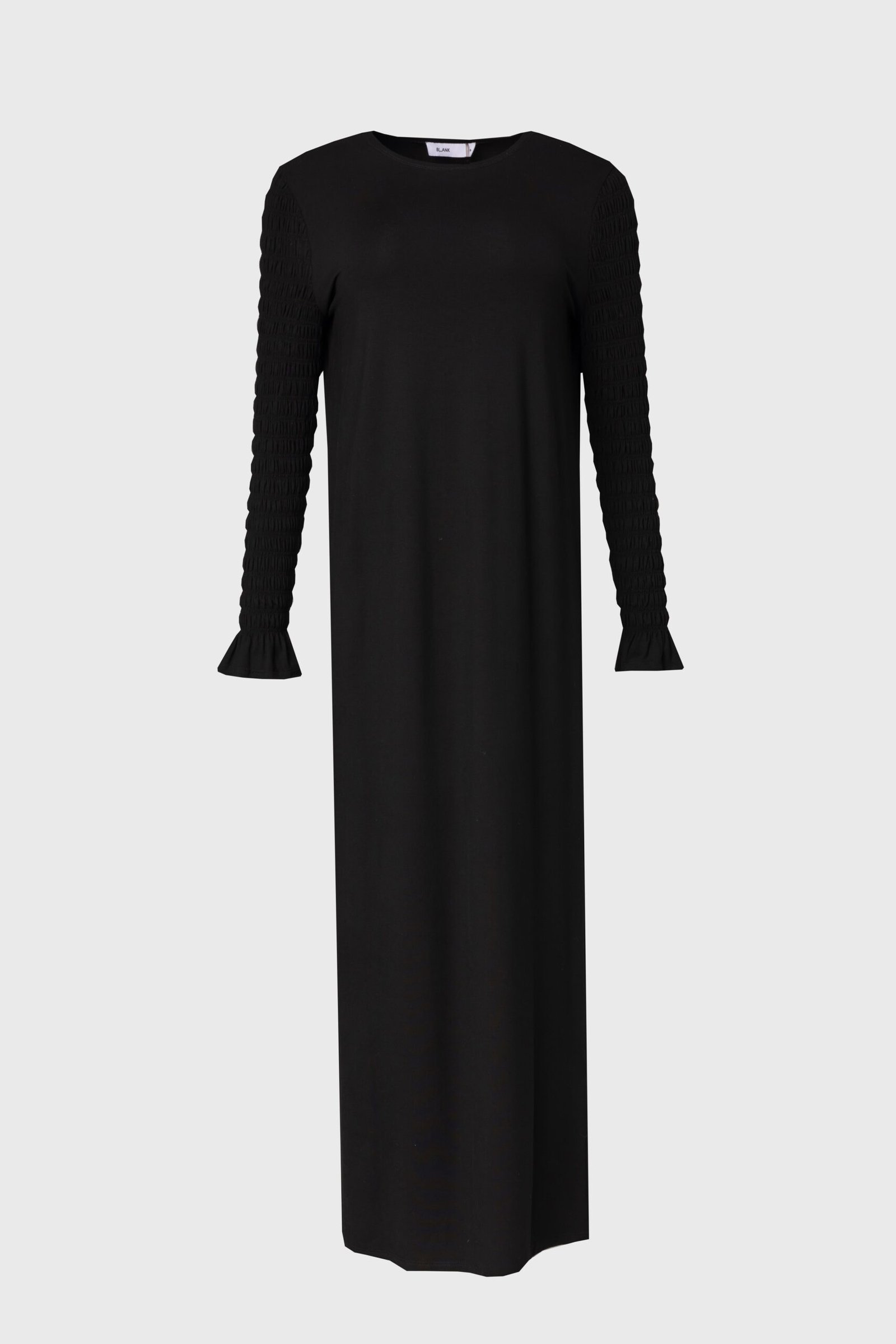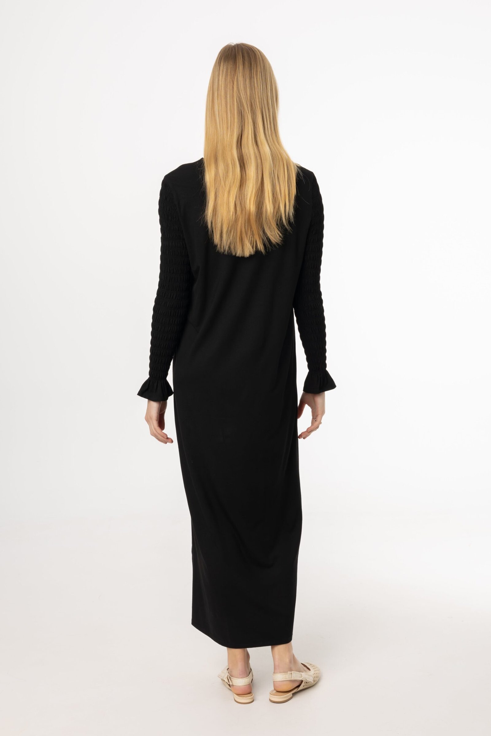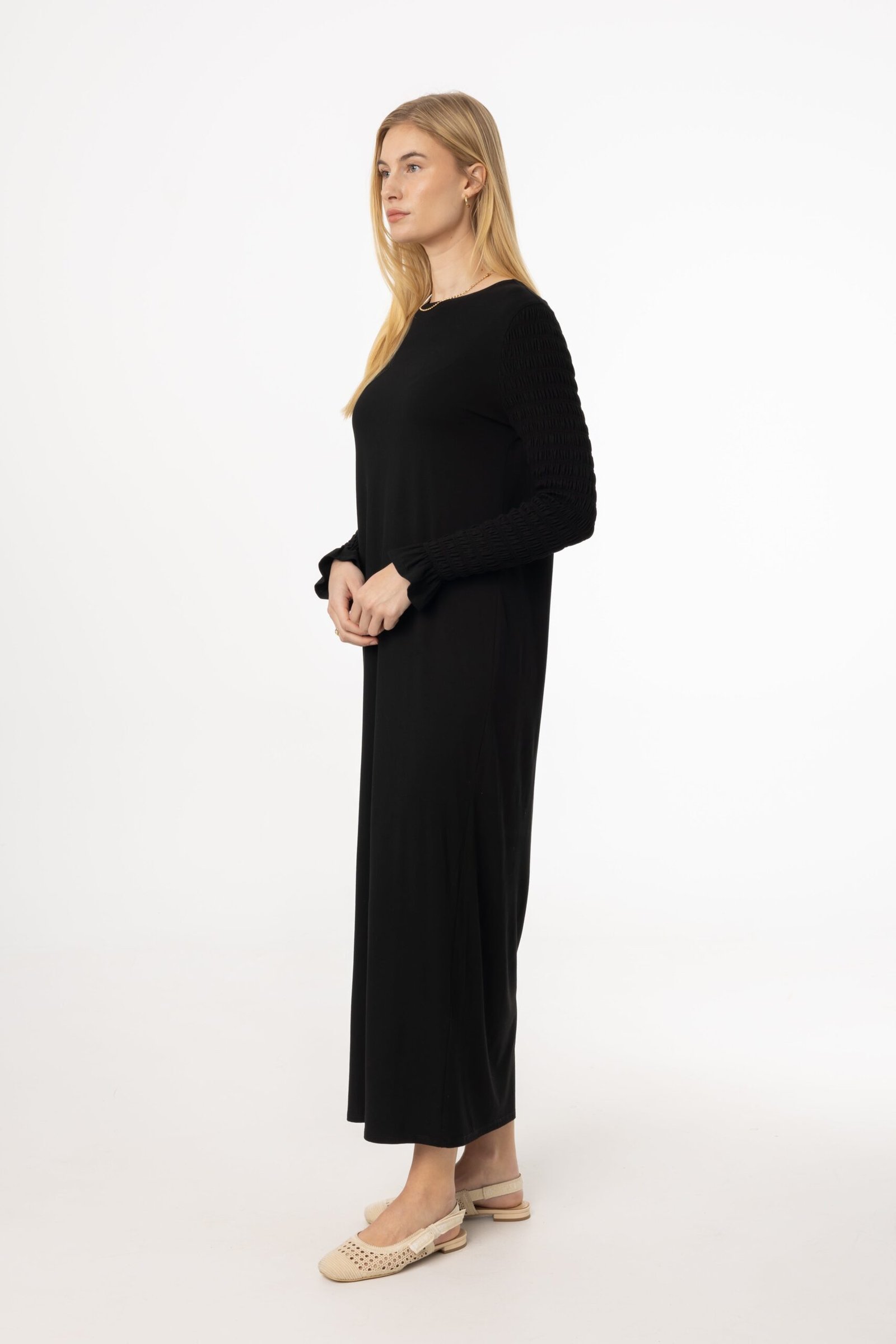 Black Smocked Sleeve Maxi Dress Your go-to Friday night dress is redefined. The smocked sleeves add a romantic touch. while the maxi length keeps it sleek. Heading to a gallery opening or making an entrance at an exclusive event. just wear heels. classic red lipstick. and an air of quiet confidence. Wide Neck Long Smocked…